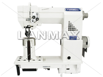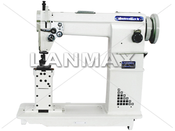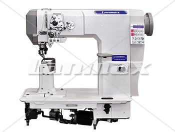 Coluna transporte triplo direct drive com painel embutido, iluminação LED na área de costura, levantamento, corte de linha, retrocesso e costura programável. 1 agulha.